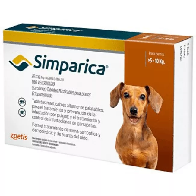 Simparica es un antiparasitario externo en tabletas masticables. Es la solución más completa, segura y eficaz contra pulgas, garrapatas y ácaros. Tratamiento efectivo durante 5 semanas (eficacia sostenida). Prevención y tratamiento de la sarna (efecto acaricida).