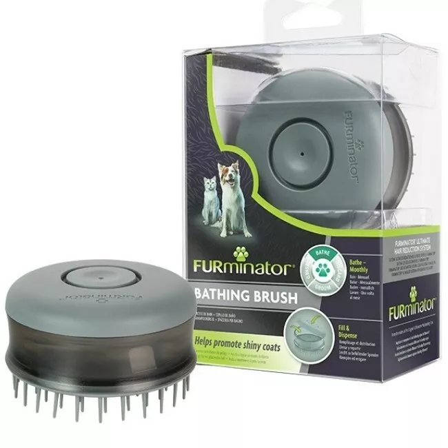 El cepillo de baño FURminator contribuye a un pelaje brillante. Úselo una vez al mes sobre el pelo húmedo, cuando bañe a su mascota.